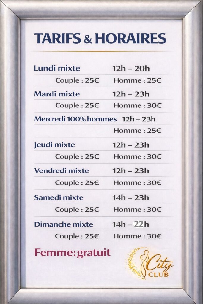 L’activité et prestations mises à disposition par le City Club, sont celles de : SAUNA, HAMMAM, Bar, TV.